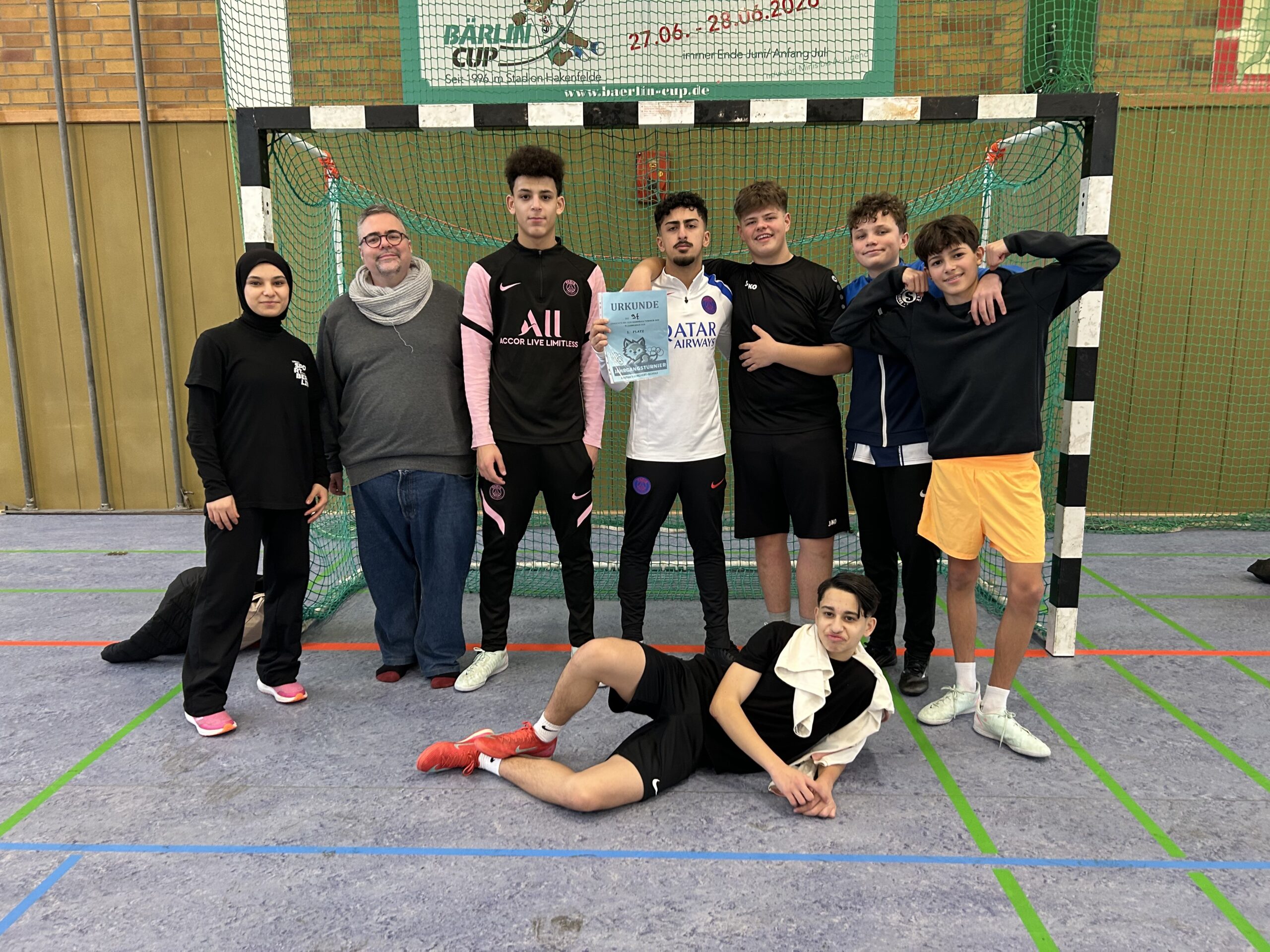 Die 9. Klassen konnten sich in einem der Schwerpunkte des Sportunterrichts messen, anstatt nur im Klassenverband Unterricht zu haben und bewertet zu werden. Die zeitgleich ausgetragene Handball-Weltmeisterschaft könnte spannender nicht sein als dieses Turnier. Es war streckenweise wie ein Krimi! Alle Klassen waren mit Feuereifer mit ihren Teams dabei. Die anderen aus den Klassen und die Klassenlehrkräfte feuerten eifrig an, es gab sogar eine „Fanbank“ auf jeder Seite, auf der die größten Fans jeder Klasse ganz nahe am Spielfeld mitfiebern konnten. Die Schülerin und die Schüler der Klasse 9f, die verdient gewonnen haben, halfen sogar in anderen Klassen aus. Trotzdem hatten sie noch genug Kondition für den Sieg. Herzlichen Glückwunsch an die Sportskanonen der 9f!